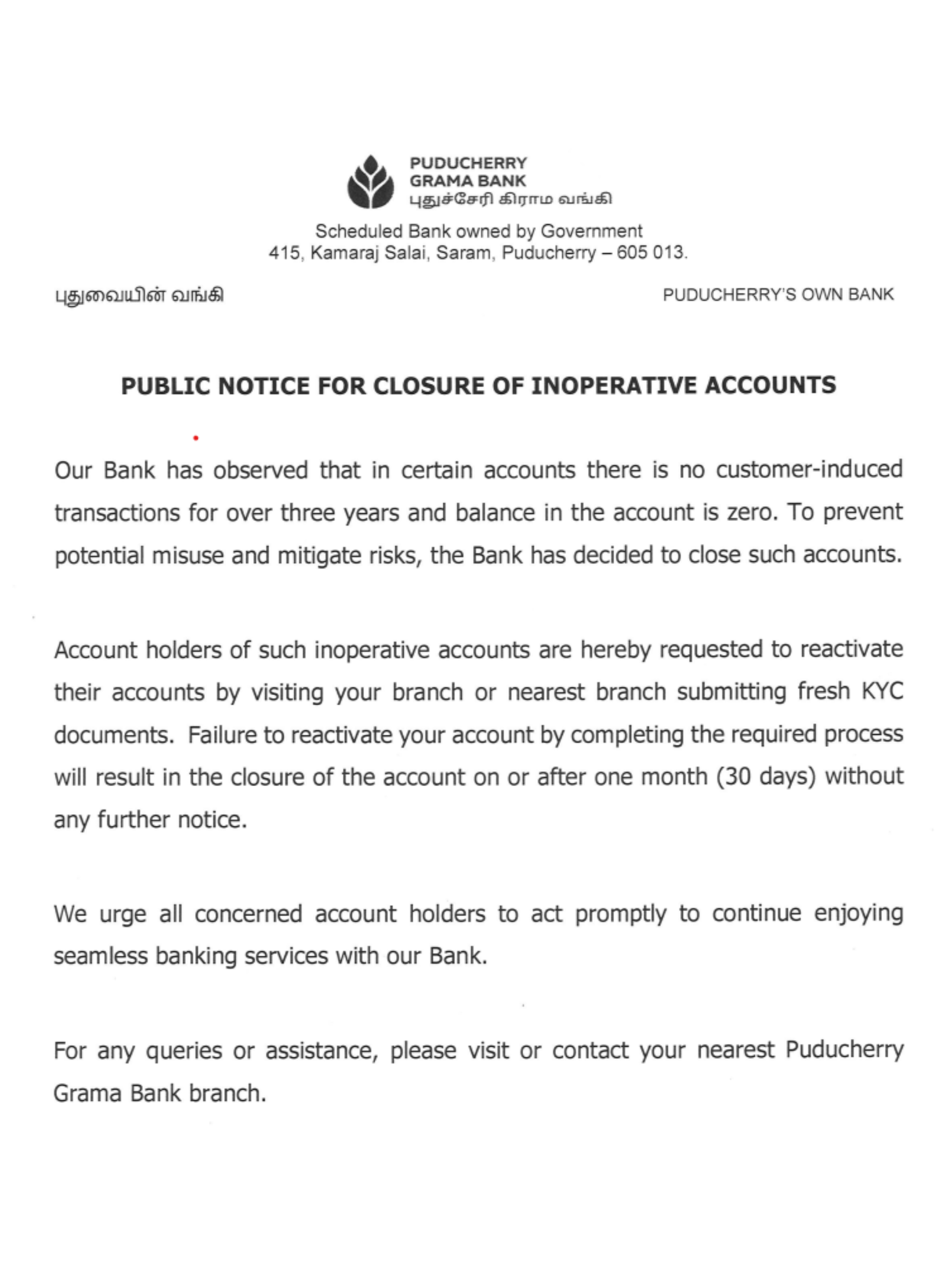 Sponsored by Indian Bank was established on 26.3.08 by Government of India vide Ministry of Finance notification no.1/16/2007-RRB (i) dated 26.3.08. The bank was inaugurated by Mr.P.Chidambaram, Hon’ble Union Minister of Finance on 01.6.2008. Sri.V.Narayanasamy, Hon’ble Minister of State for Parliamentary affairs, Sri.N.Rangasamy, Hon’ble Chief Minister of Union Territory of Puducherry and Dr.M.Ramadoss, Member of Parliament, Puducherry and Sri.M.S.Sundara Rajan, Chairman & Managing Director of Indian Bank and Sri.A.S.Subramanian, Executive Director of Indian Bank were among other dignitaries who took part in inaugural function.